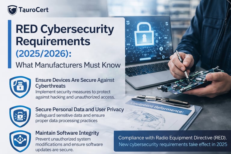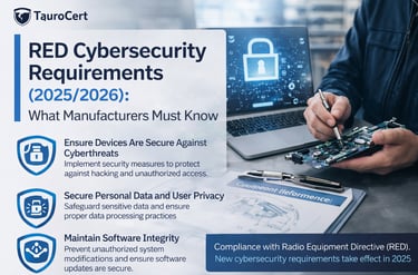 👉 TauroCert supports manufacturers in navigating RED cybersecurity requirements, including applicability assessment, certification strategy, testing support, and technical documentation.